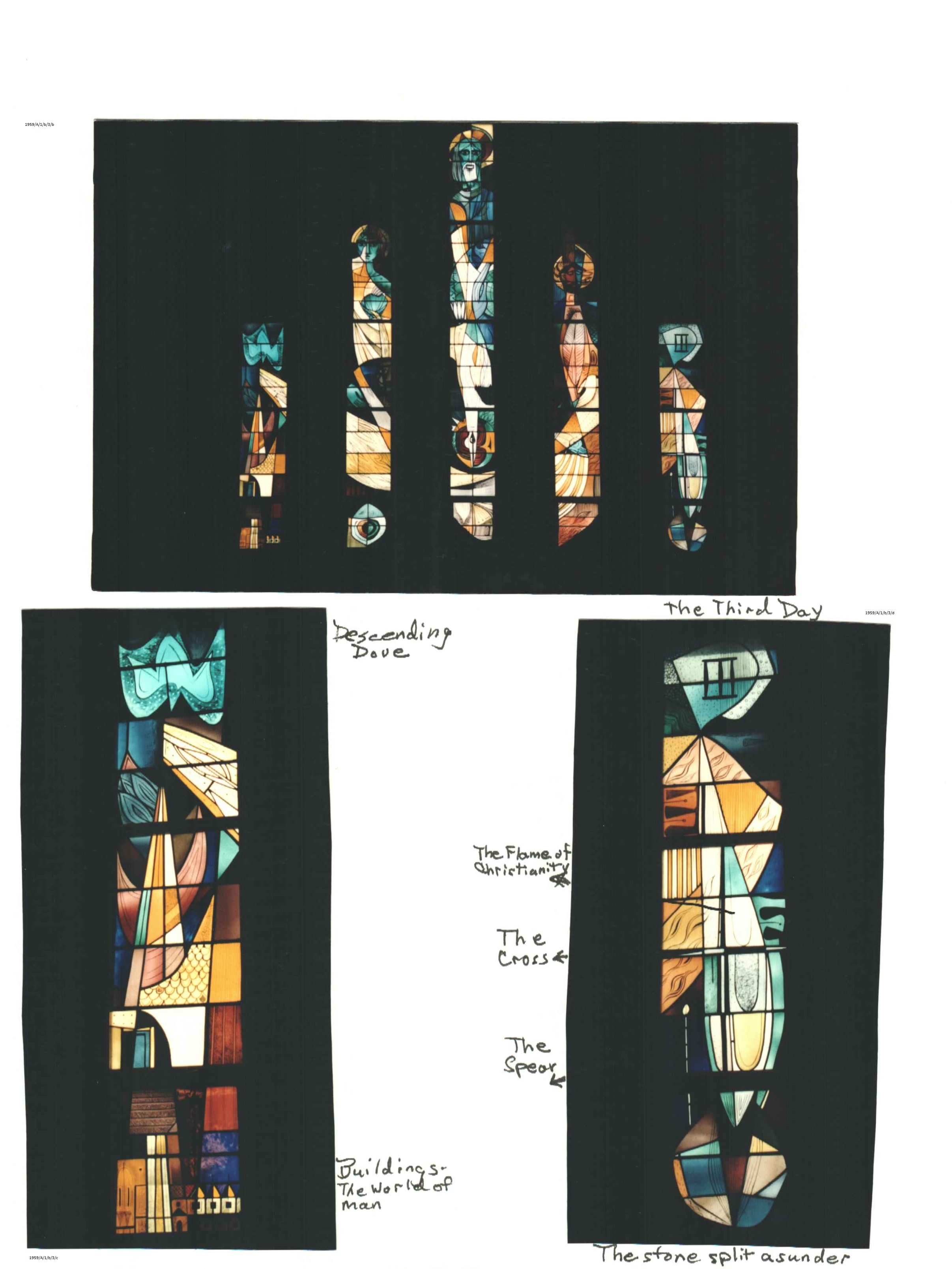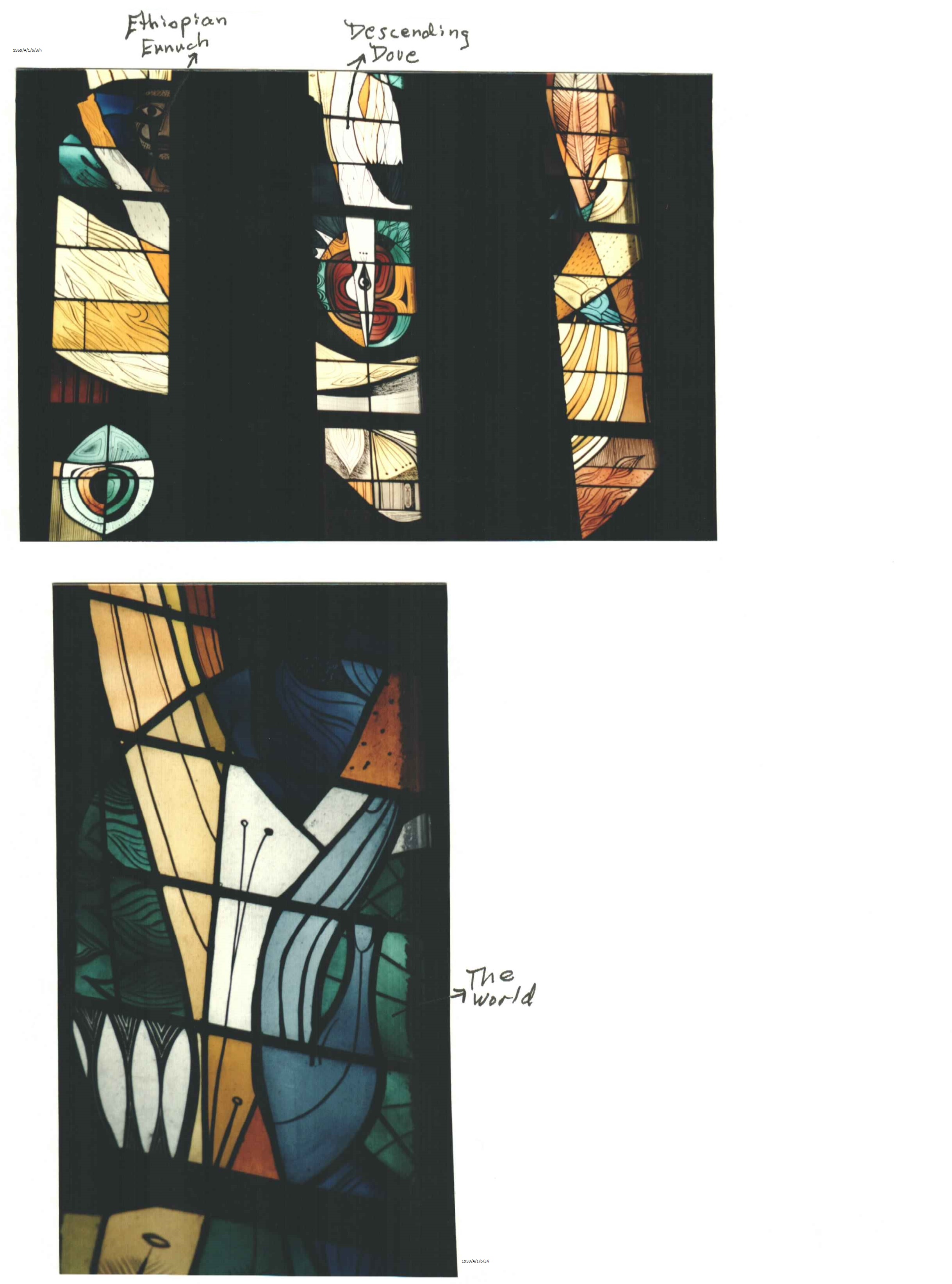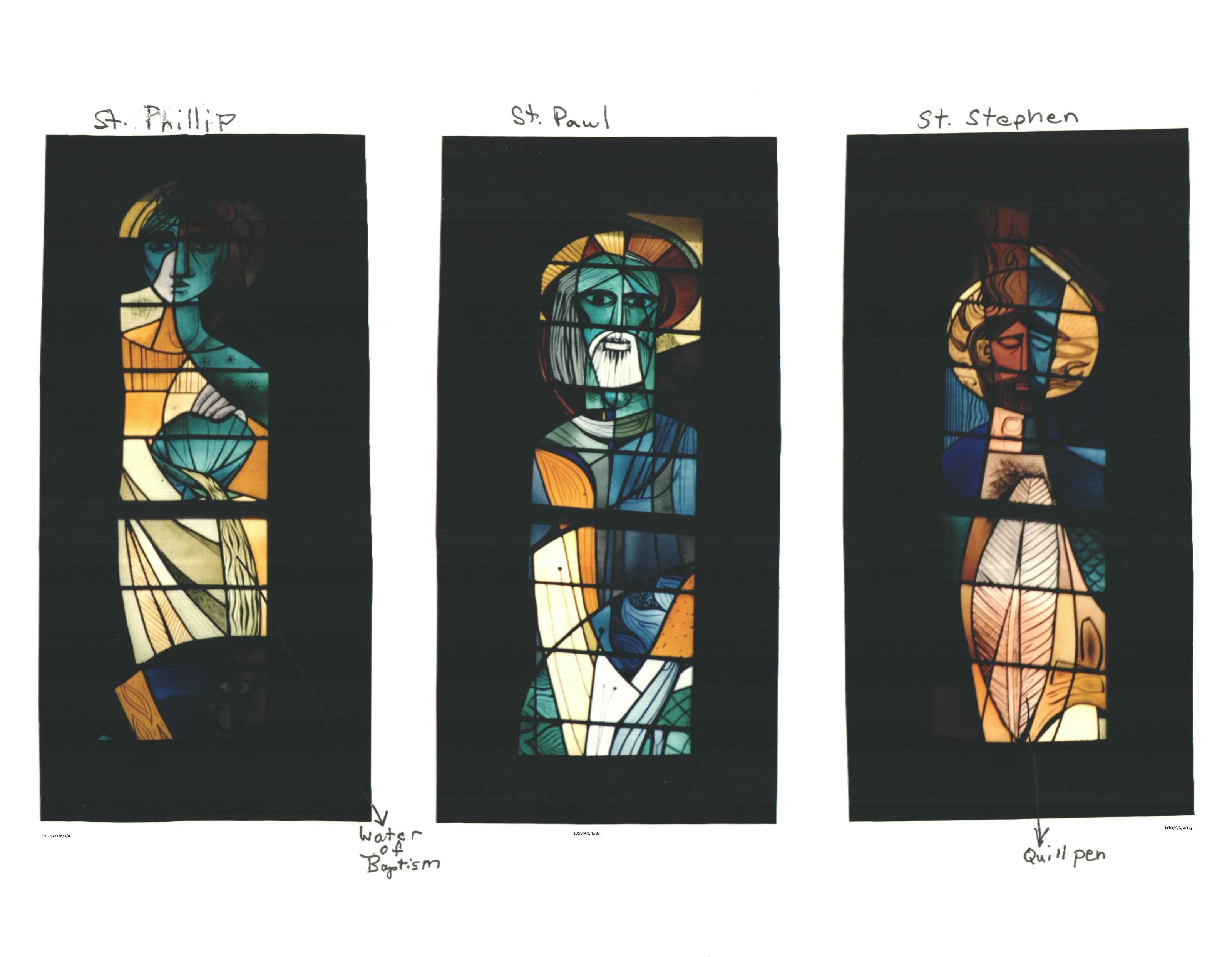 Installed in October of 1968, this group of windows was the last to be placed in the Sanctuary. The center window symbolizes our namesake, St. Paul, an apostle and missionary. The window to its right represents Stephen, the first Christian martyr stoned to death in early Christian times. To the left of St. Paul is the window representing Phillip, one of Christ's apostles who baptized an Ethiopian eunuch and instructed him in the meaning of the Christian faith. The window on the extreme right symbolized the Resurrection. The Roman numeral III at the panel's top reminds us that Christ rose on the third day. The descending dove is on the extreme left window, meaning the Holy Spirit enters the world's life.